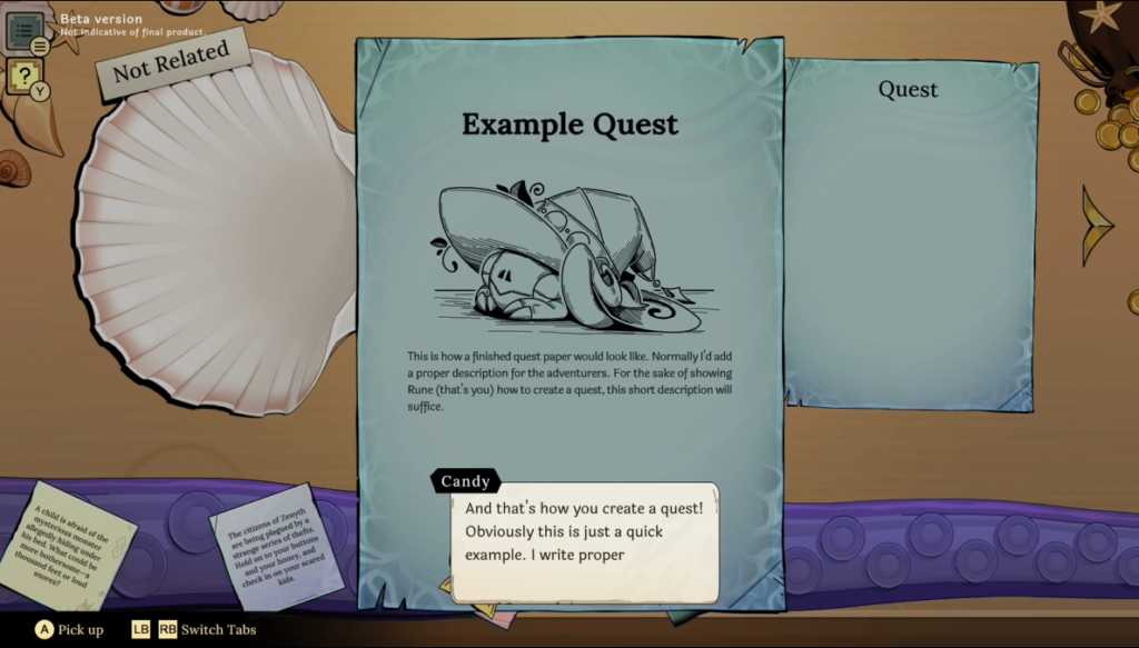 Each night you’ll compile your thoughts to create quests for these brave adventurers. Choose from your post it notes which belong together and you’ll see a quest appear in front of your eyes. After the quest is built, it will be posted on the board in your bar waiting for the right adventuring party to come along. The quest will also lead back to you as your drinks will help inspire them or boost some of their stats. Again we ask, are we making beverages here or are we making potions? Perhaps we’ll need to play the full game to really know the truth. We’ll just tell you that fate isn’t written in the stars but it may be in your cup.