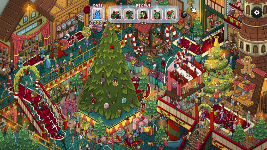 Each 10 – 15-minute stage has around 100 kitties and a handful of other objects to move around the screen to find. There are eight locations to explore and find all the delightful cats and other festive themed characters. As you work your way through, more of the level will fill with delightful festive colours.