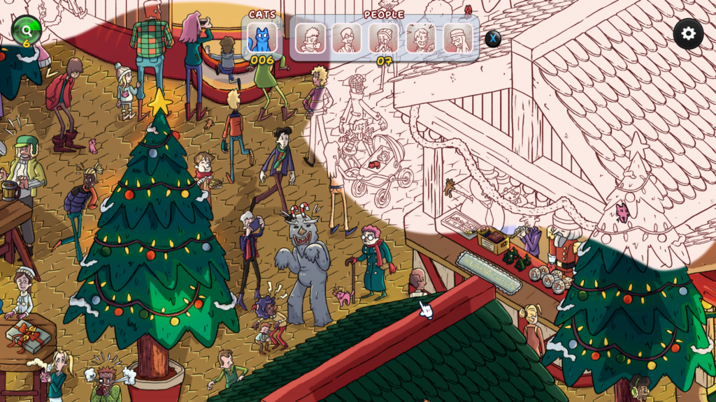 There’s some quality of improvements here that long-time fans of the genre will appreciate. In previous titles, the background colour would only begin to fill on the main city (or similar) stages. Now, this applies on all stages making finding your remaining cats much easier. Also, the final Christmas Market stage only has a small number of people to find. I have previously complained about having to find ~100 people alongside >100 cats in the finale stages as it became a grind. These minor changes streamline the experience and reduce the eye strain.