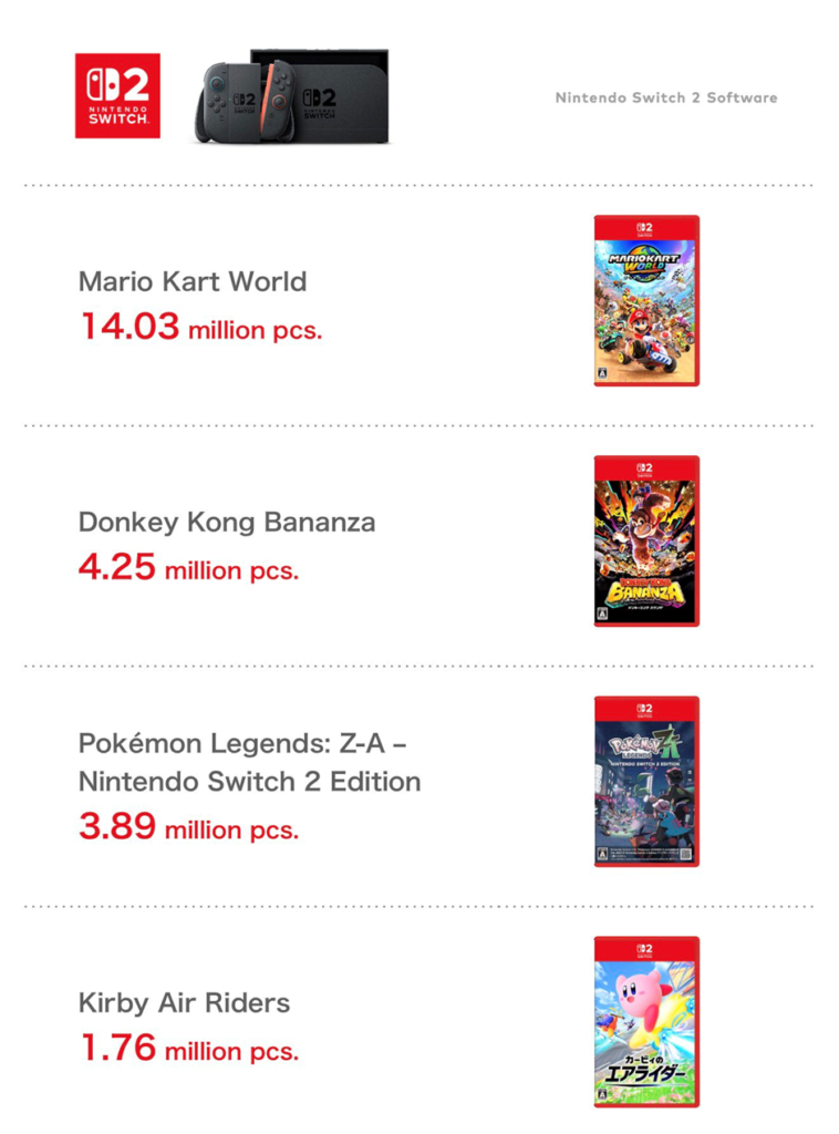 Outside of Mario Kart World, the other highest selling Switch 2 games are the incredible 10 / 10 Donkey Kong Bananza which has shifted 4.25m copies, and Pokémon Legends Z-A which itself has shifted just shy of 4m copies. No sales numbers have been released for Metroid Prime 4, though it could be under 1.7 million copies given the lowest selling game Nintendo released figures for is Kirby Air Riders, which has sold 1.76m.