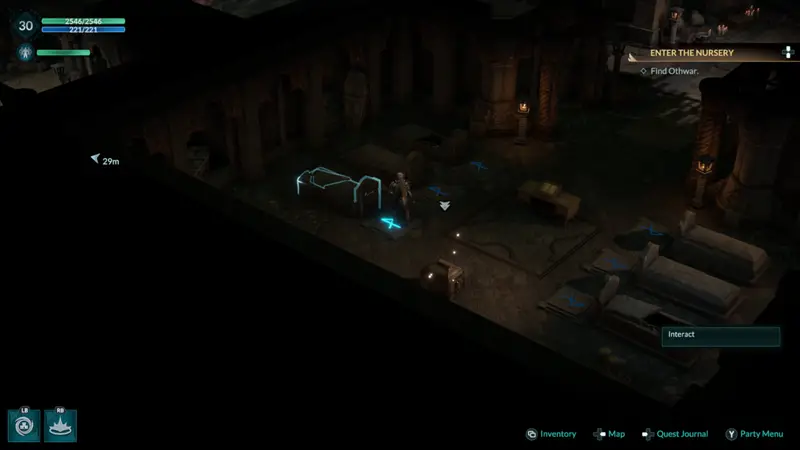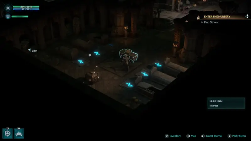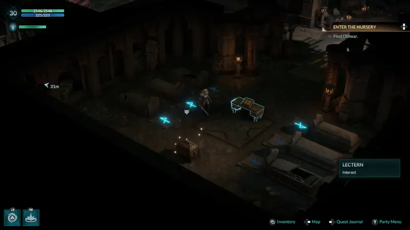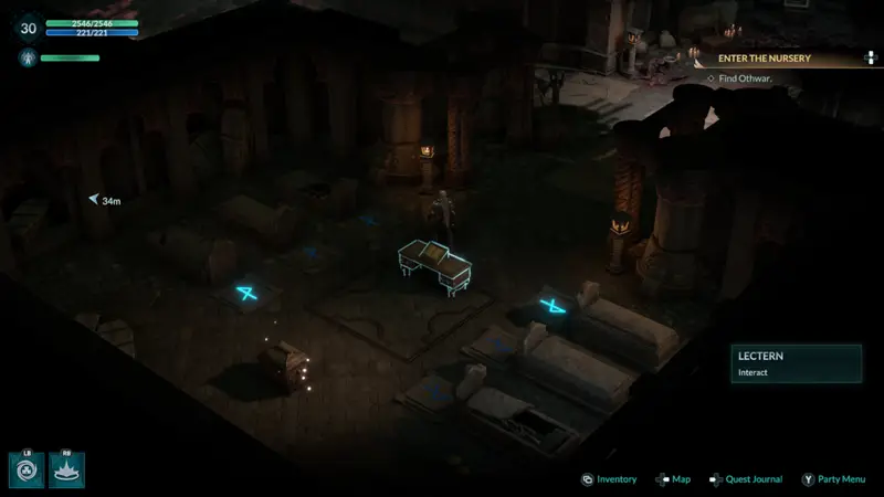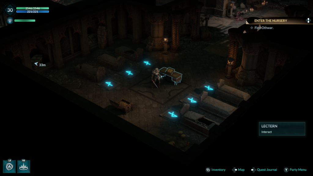 Once in the second level of the nursery head down and around a flight of stairs, passing a character for one of your companion quests. When the area splits off multiple directions take a left and you will find the Heroes Trial area with the 6 tombs, a Lectern and the treasure chest.