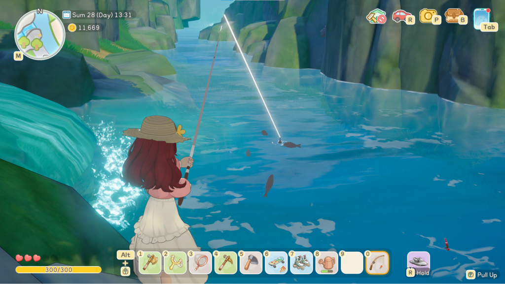There are many locations to fish on the Starsand Island map, including more to discover once unlocking the boat. Look for ripples in the water to determine if there are fish around. Cast your line in front of the fish and wait for it to bite. Once you have hooked the fish, reel it in. If the fishing line turns yellow, take warning the pull is becoming too much. If it turns red the line will break if you continue to pull. Giving slack, and reeling in again will help bring in the fish.