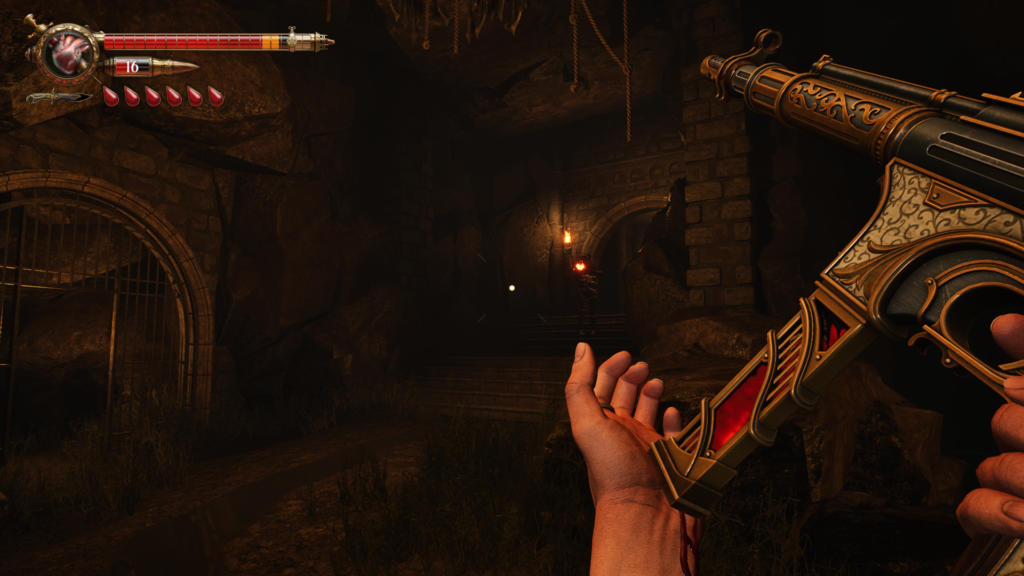 That said, Crisol does have many of its own ideas. The most unique mechanic in Crisol is its approach to managing blood, which is both your health bar and your ammunition. To reload, Gabriel will transfuse blood from has right hand into the chamber using animations that you’d expect to pay a microtransaction fee for in Call of Duty. My favourite weapon, the pistol spits out tiny needles into Gabriel’s palm to draw blood to the red and gold hand cannon. It was as cool at the end, as it was 30-minutes in.