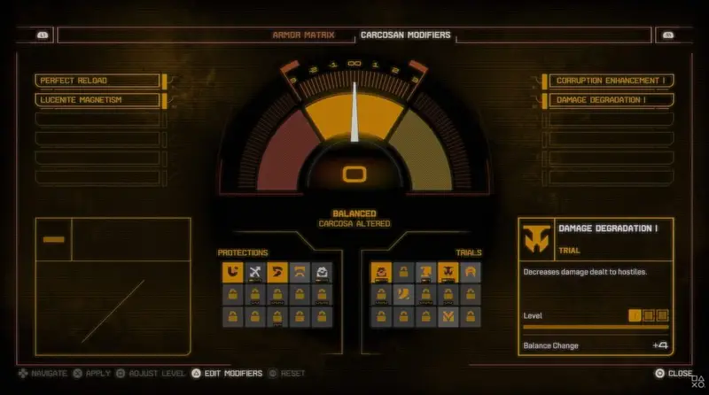 With Carcosan modifiers, you can adjust your experience to make Saros more challenging or more forgiving. Carcosan Modifiers come in two types: Protection Modifiers reduce challenge by doing things like decreasing incoming damage, making it easier to reload your weapon, or extending the time you can use your Shield. By contrast, Trial Modifiers make the game more challenging by making Hostiles more aggressive, your weapon’s power degrades over time, or even removing your Second Chance ability entirely. The combination of Modifiers you choose is entirely up to you, but crucially, Protections and Trials must be kept in balance to ensure a consistent challenge level.