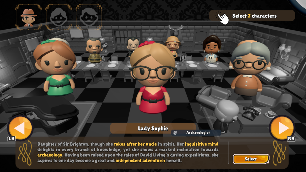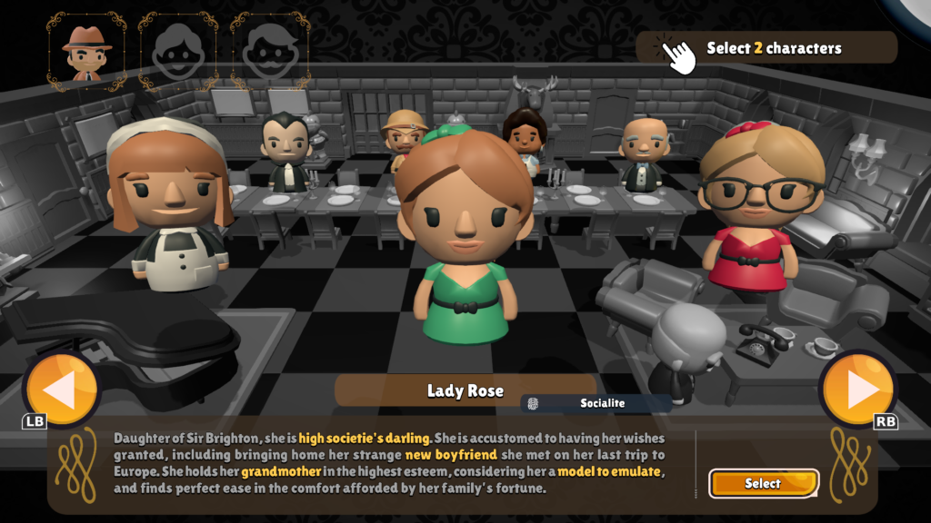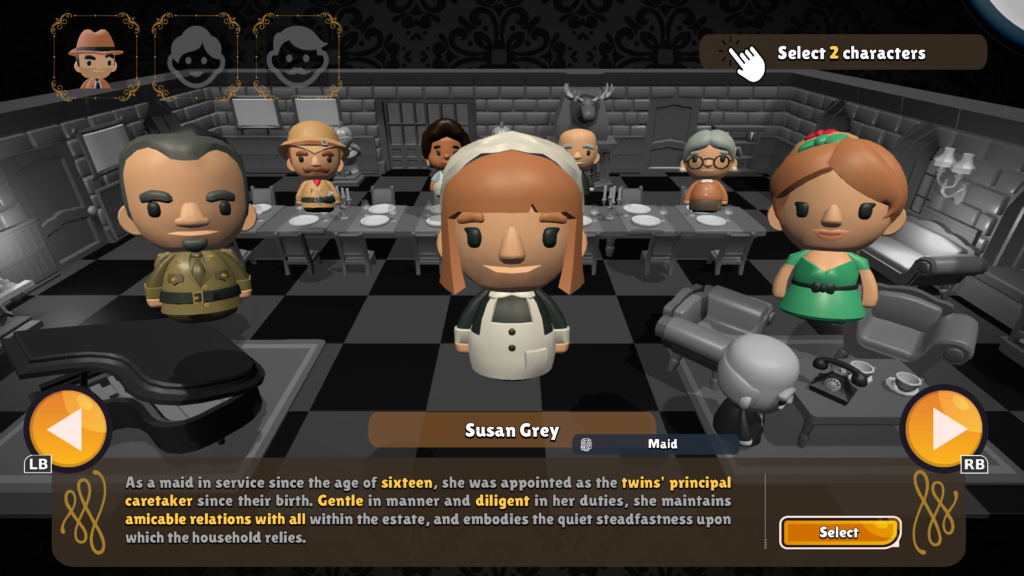 As the detective, choose two potential suspects to be your assistants for the next two hours while you investigate. This does mean that these two are unavailble for interrogation during this time so make sure you swap them out on your next run. You’ll start as the investigator telling everyone to go to their room and wait. Except the two you elect of course. They will get to explore the mansion as they please to investigate. You’ll want to make sure that you look at everything with each character to ensure you get the full picture. Each character will have different reactions to items and other characters so you’ll want to be sure you investigate everything.