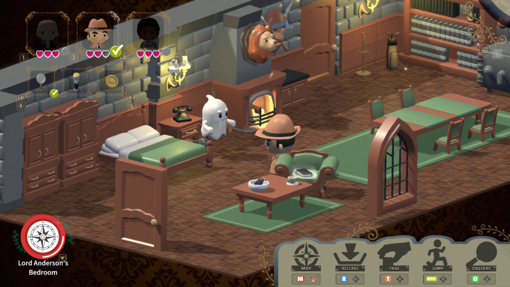 Another frustrating bit, although realistic, is that Items aren’t shared between your three investigators. This can mean if the investigator needs a key from Miss Gray, you have to bring them all together to swap items or open the door. This is frustrating if you want to see the different perspectives in a room. Thematically it makes sense to not have the doors open for everyone to hide evidence, but the suspension of reality would be nice in these moments. Again, you end up wasting time swapping characters to bring them together. Frustrating, especially when they have so few inventory slots.