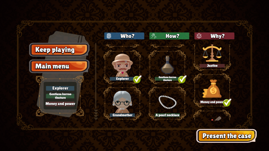 At the end of the 2 hours, you’ll be brought right to the screen to make your accusation with the information you’ve collected. You’ll bring what you’ve deduced to Scotland yard when they arrive. Have you uncovered enough information? Were you able to get to the truth of it all before they arrived?