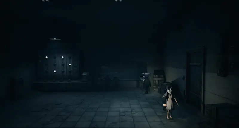 Exiting the lift, head into the surgery room on the right and crawl under the desk to find another room.