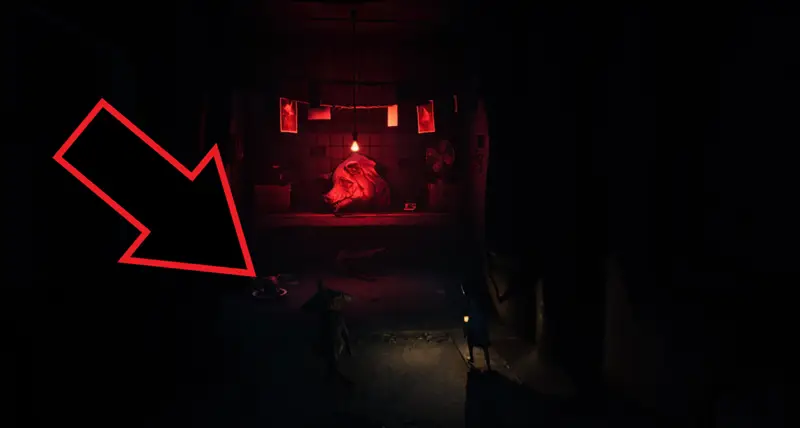 Go through it to find an unsettling darkroom with a giant pig head on the counter. (far too big to wear!)