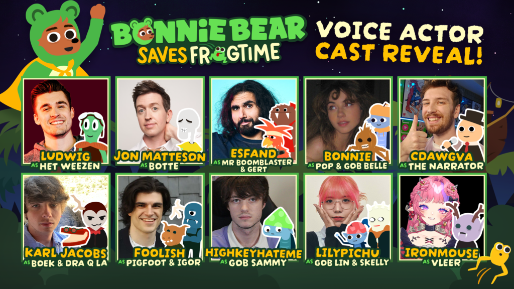 It’s clear Bonnie Bear Saves Frogtime is a passion project. Based on the voice cast reveal, the VA’s have brought their passion to the characters as well. For those who are nor familiar with the content creator spaces, not to worry, many of these voice actors bring quite a repertoire with them.