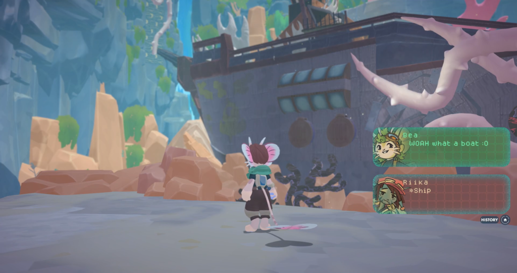 The final section is centred around a giant shipwreck, one of several clues that somebody, possibly other Muri, had been here before. I hear a trill as I look around to see, sitting in a nest, drenched in corruption, a Squawk Bird similar to the one that led Pelle to the island. Hosing down the ship’s hull causes two oars to rise that create a path to the animal, before I head inside the vessel to find more suffering Squawk Birds.