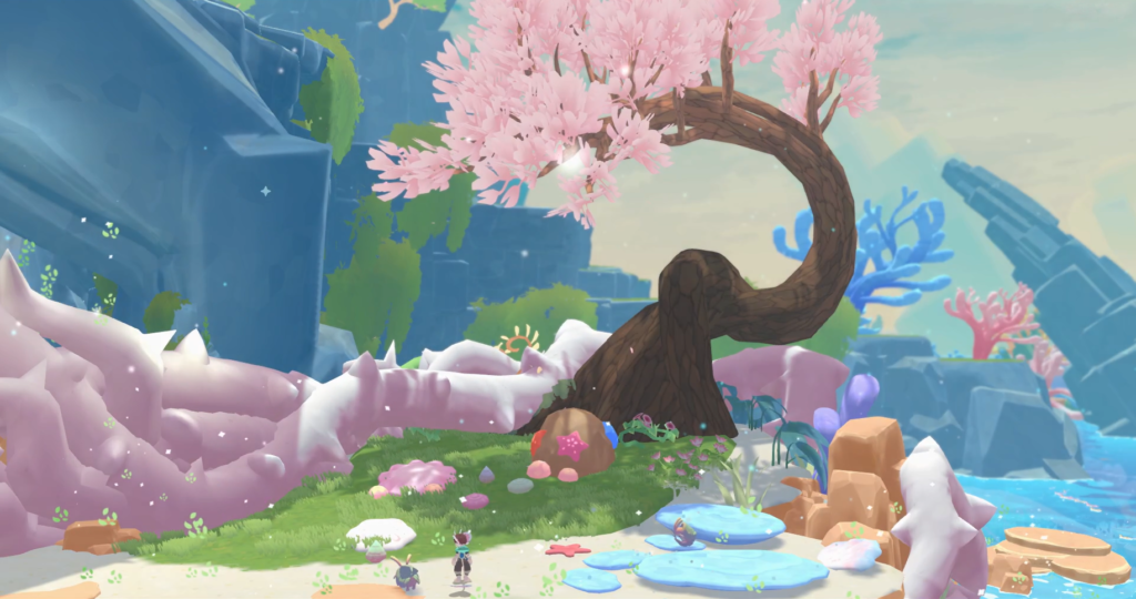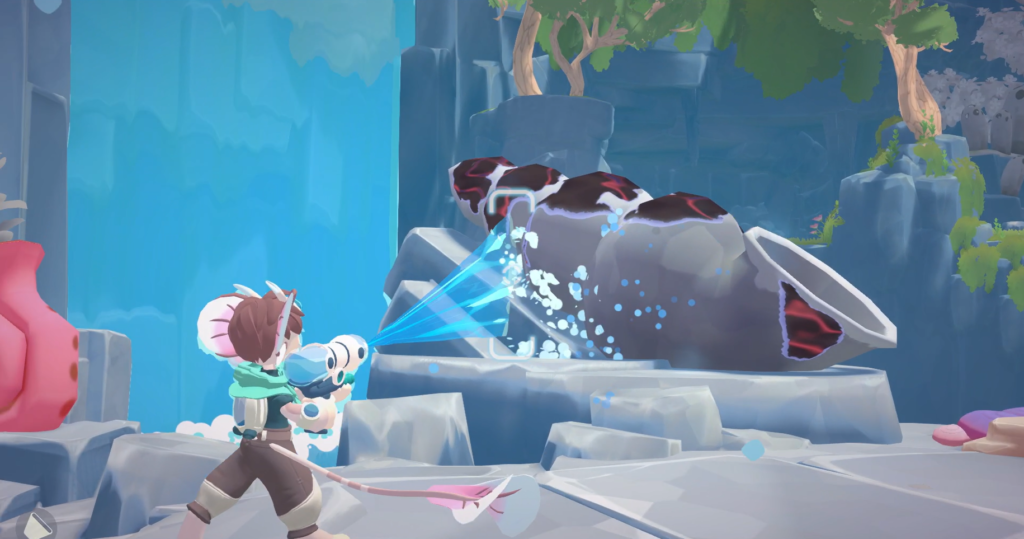 A quick spray from my water gun shrinks the brown sludge down until it disappears with a satisfying “pop”, as well as cleaning up several crustacean-like creatures that were caught in it. Cleaning patches of corruption also releases small droplets that fly toward Pelle, though the demo doesn’t fully explain their purpose. With no resources to manage, I adjust the nozzle of my water gun for a wider spread and tackle several other clumps of corruption further into the cove.