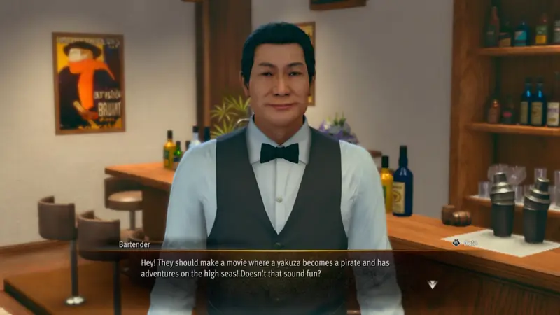 Here, you will be tasked with dealing with a group of drunk movie cosplayers causing issues for the bar. Head over to Bantam near the Millennium tower. Inside, you’ll have to defeat the drunks, dressed as yakuza. Once that is done, head outside, and you will receive a call from Zenba. He said the barowner has sent an SOS, and that the drunks are back. This time, they will be dressed as pirates. Defeat them once again to end this. The bartender will make a nice little tongue-in-cheek joke.