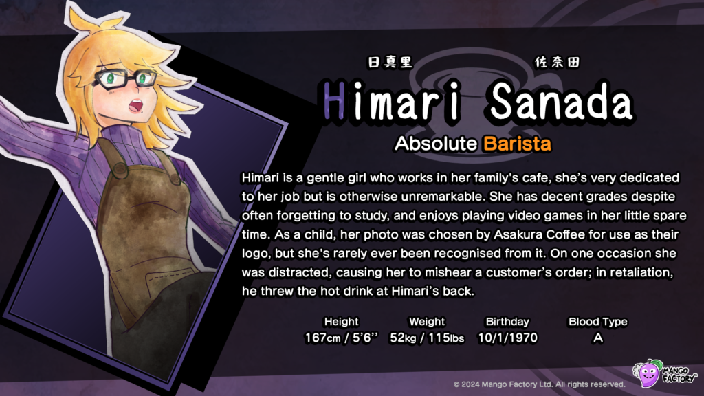 At first glance and to the untrained eye, it may appear to look quite familiar and it should. Kumitantei: Old School Slaughter takes inspiration from Rumiko Takahashi’s artistic styling and Danganronpa’s narrative design. Yet, there is something that seems to be poking just a bit of fun at some of the archetypes of characters you could find in a Kodaka work. In Kumitantei you’ll play not as an ultimate lucky student, but as an absolute barista named Himari Sanada. As Himari, investigate murders, bond with your fellow absolutes, and get to the bottom of the murders and your kidnapping. In the far off year of 1989, can you survive the kill or be killed Apathy Experiment?
