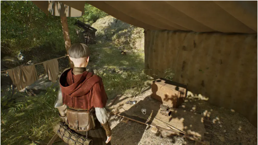 Before heading through the wooden fencing, turn back on yourself to the right and spot a ledge you can climb up. Follow the path up and round and cross the wooden bridge above where you just were. Keep following the path until you find a small camp. On a bed you’ll find the weapon part.