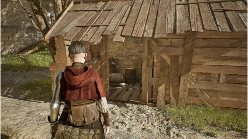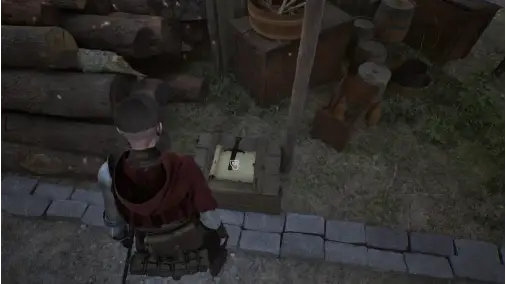 As you progress, you’ll hop a wall that brings you to a main road with a barricade off to the right, made out of carts and such. There’s a big cage that you can wheel to continue the main path. Approaching that cage that’s on your right, there will be some logs of wood just sat to the left of the road. Next to it is a crate with the paper on it, a dagger sticking out of it.