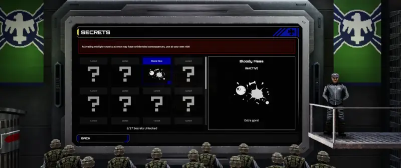 There are various Secrets that can be unlocked throughout the game. What do they do? Aside from the one I found called “Bloody Mess” which generates extra gore in the game, I could not tell you. I’ll get into that when we discuss The Good and The Bad of Starship Troopers: Ultimate Bug War!