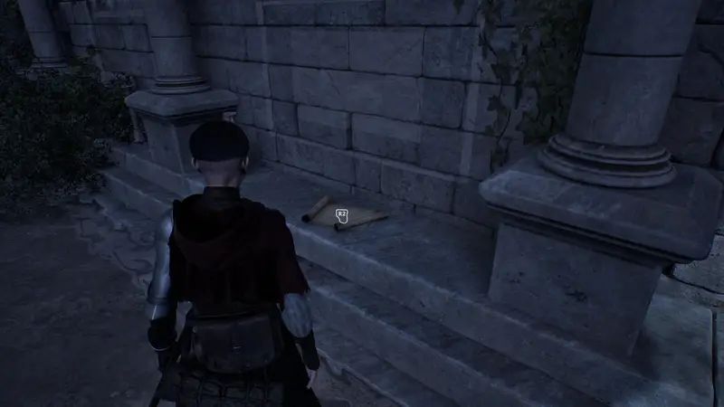After the first combat encounter. Head up the staircase behind where the enemies were stood. At the top you’ll enter a long room with a statue to the left. The papers are on the floor on a cloth, next to some food.