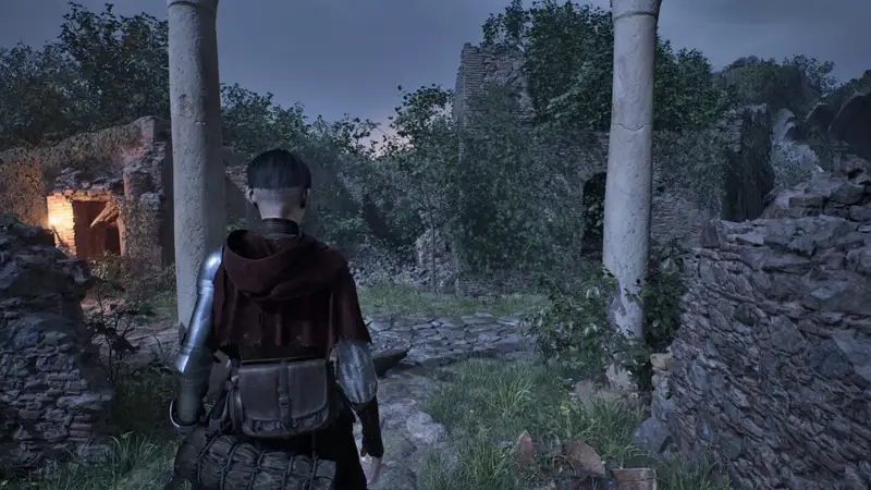 First off, head to the right and stick ot the right, you’ll go down a small set of steps and find a little alcove you can crouch into. Aeta will comment on it being a ‘hypocaust’. Crawl through until you get through into the ruins.