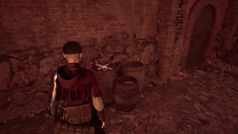Go back into the centre of the space you were just in from the statue and you should see a barrel with the papers on it, to the left against a wall.