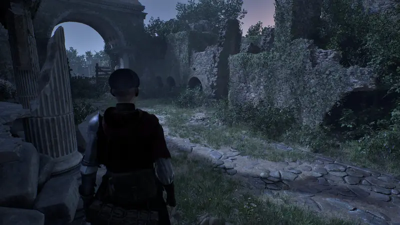 Return to the ‘crossroads’ as noted above, and head to the left this time. Stick to the left and follow the path round. You’ll spot a collapsed pillar that you need to jump over.