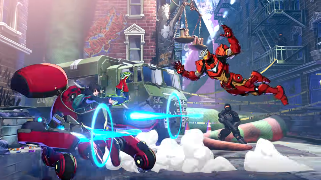 Peni and SP//dr look to be taking the role of the games first big body character. They are an unexpected choice for that role to say the least as many would’ve figured someone like The Hulk would’ve been the obvious choice for that first reveal. Their attacks certainly look wide and weighty like a big body character. However Peni also looks to have an array of traps and projectiles. This makes sense given she’s piloting a mech and could be a more uncommon take on a big body by making them part zoner.