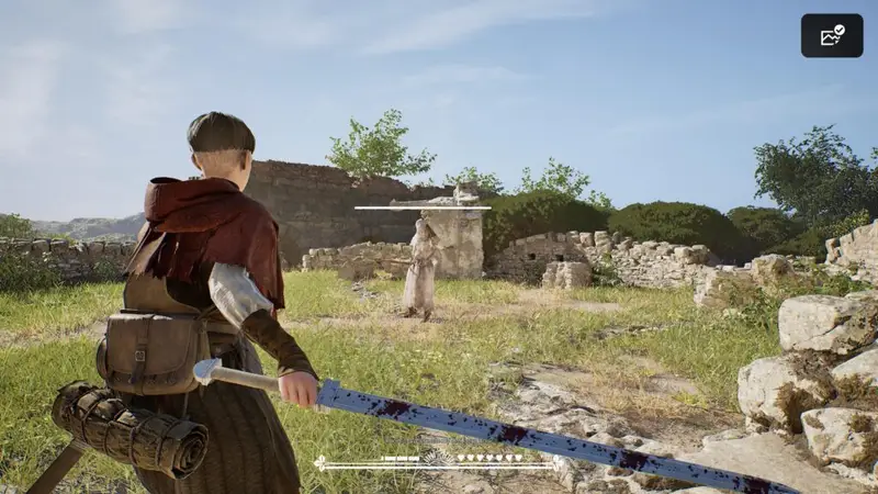 Aeta has just the one weapon, a long sword. You can fight in one-handed or two-handed stances. You have a guard bar, which acts as a sort of stamina bar before your guard is broken and leaves you open for attack. Enemies also have this, and you’ll need to stagger them before you can do damage to their actual health.