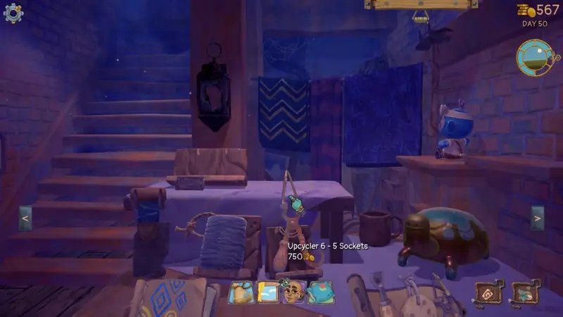 One of the most important windows will be your Workshop, this is where you’ll spend most of your real time and in-game time as well as the bulk of the gameplay. You have three tools, the chisel, sponge, and upcycler. Each tools uses up a segment of your day as well as provide a small mini-game.