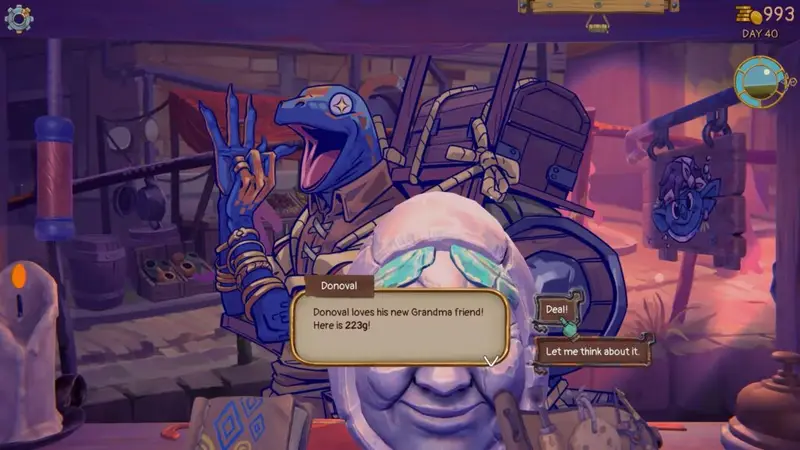 The shop’s window is where you’ll be interacting with your customers. You take requests, fulfill them, and get paid. Overtime, your relationship will improve with each species allowing for tips. Later on, you’ll also be able to expand on your window allowing you to display items on it, enticing folks to purchase your coolest (?) trash.