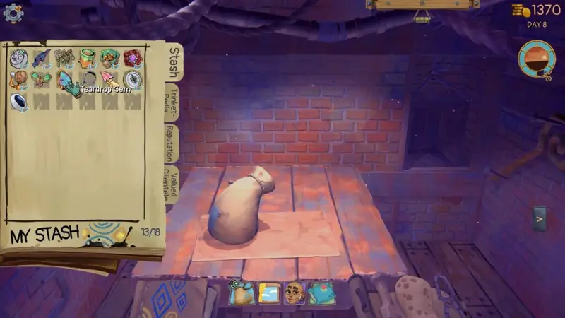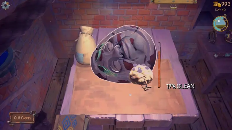 The gameplay loop in Trash Goblin is a simple one. Your day starts and you control what you want to do for the day. Your choices are to chisel and discover new trinkets, clean the trinkets you have in your workshop, combine your trinkets you have through upcycling to create unique items, or tend to customers in your shop. Everything is done at your leisure. There is no failure. Your only real restriction is in-game time.