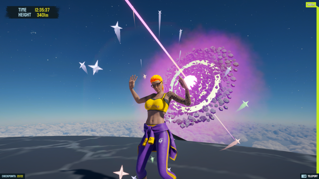 The visual design of Only Up Rush is as mad as a box of frogs. From climbing playing cards, to helicopters, to space debris, there is consistently something new to see – and ascend. Broken into roughly 20 sub-sections which include a cruise ship, board games and more, every 15-minutes or so we’re somewhere new.