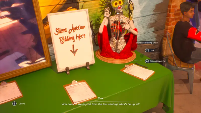 Progress the story again until you get the objective to leave the bar. Head to the table one last time and see that Vinh has once again outbid you. Put a bid down a third time and a scene will play out that will show you Vinh cheating to win the auction.