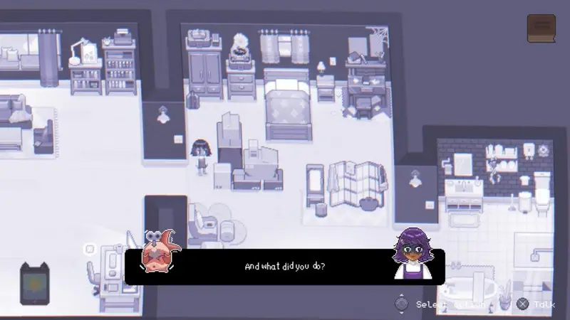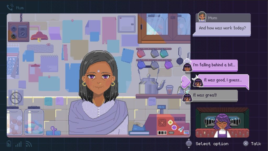 This is where the writing becomes interesting, along with the choices available to you as you converse with them. Every action results in Alo’s happiness increasing and declining. Depending on where you are on the spectrum, some choices aren’t available to you at all. As if her current state of mind cannot even begin to fathom an alternate choice. The gamer controlling a character in me is frustrated that hunting for a collectible within the game forces me to click on everything. This means having no choice but to doom scroll Alo’s social media, lowering my happiness, because her current state of mind doesn’t allow her the willpower to put the phone down.