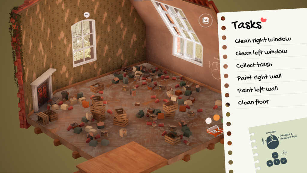 When loading into any level, any tool players need to accomplish tasks will spawn in. Tools for renovation like a paint roller and a crowbar, for ripping up flooring. A mop, window squeegee, and garbage can to also help clean up left behind messes. A list in the top right corner will shows what tasks need to be finished before furniture and decor boxes can be brought in.