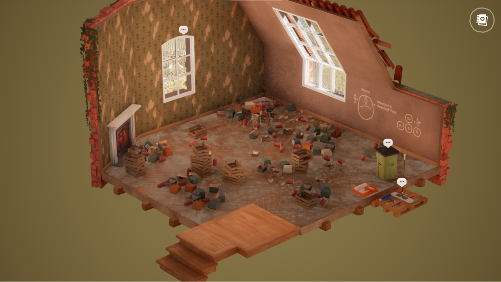 As you play Hozy, you’ll notice that some (not all) furniture and décor have little icons when you hover over them. Some control the lighting, others start the music, and a few… Well, I’ll let you click them and discover their secrets for yourself.