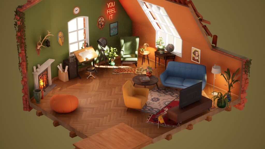 The atmosphere in Hozy is specifically crafted to surround the player in warmth and quiet comfort. Have you ever heard of the concept of Hygge? (pronounced hoo-gah) It’s a Danish word meaning “a mood of cozy”. Hozy is the perfect example of hygge, expressing it through its warm lighting, soft atmosphere, and inviting spaces.