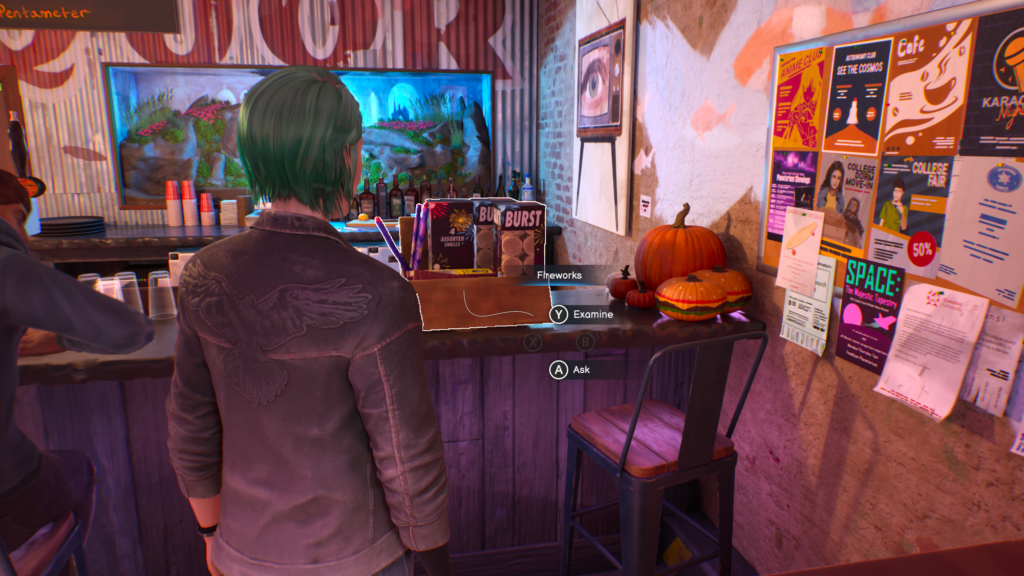 You will eventually take control of Chloe in this chapter inside the bar. Next to the Employees Only door you will see a couple pumpkins on a shelf infront of the window. Interact with it and then take a sketch of it.