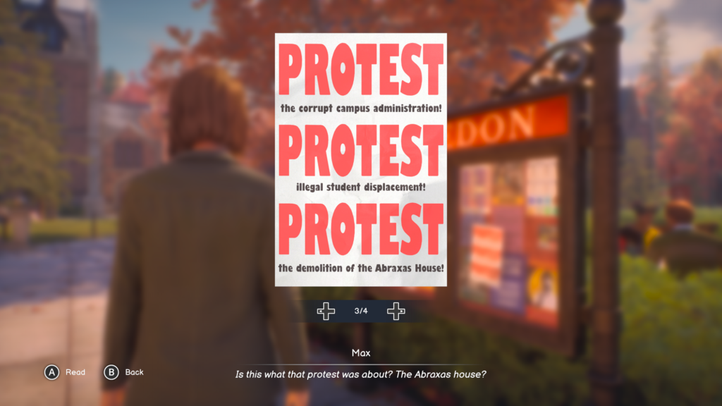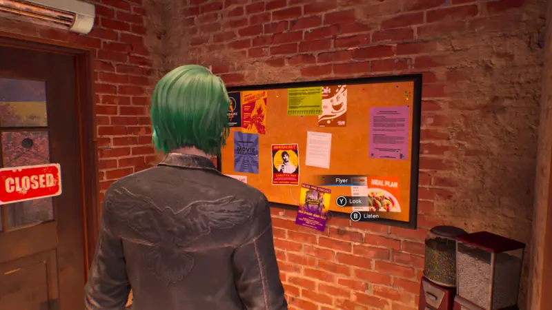 From the graffiti turn around and follow the path all the way around until you see a board with a bunch of things posted on it. Interact with it and make sure to scroll through to the fire warning flyer and the protest flyer as you need both as evidence.