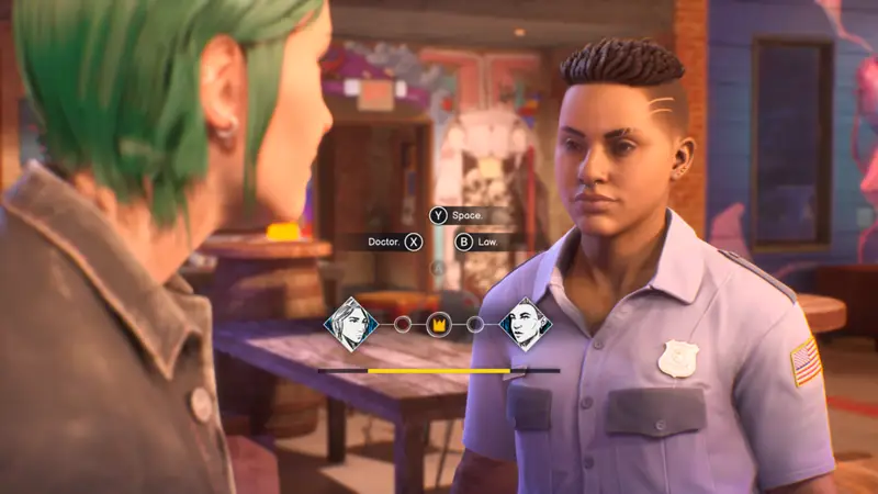 After progressing the story and learning some info about the protests you will head to the other side of the bar to speak to Joey. This will be another backtalk section where you must get everything right in order to unlock the achievement. Select: