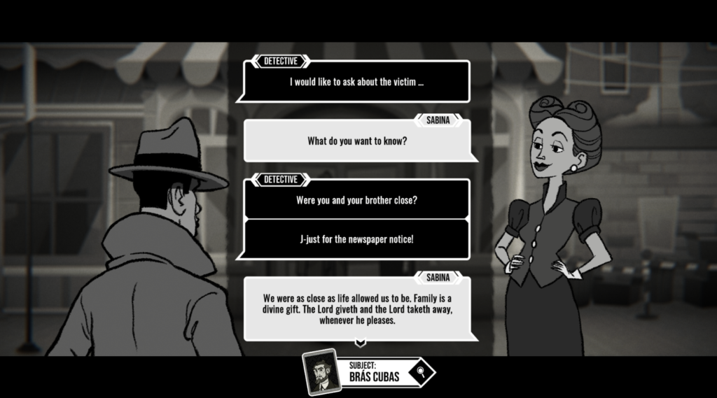 When you’re investigating a suspect and you’ve basically cornered them into telling you their involvement in the situation, the lighting changes. They are on the spot and they must tell you what they know. Visually you can see that you are now doubling down on your interrogation of them and you’ll be visiting with Brás soon to discuss what you’ve learned. With everything being in black and white, it truly is up to the art itself to speak volumes and it does. Whether it is Sophia with her eyes closed and hand on her face or her eyes darting away from the investigator, the art sets the tone the words are trying to convey.