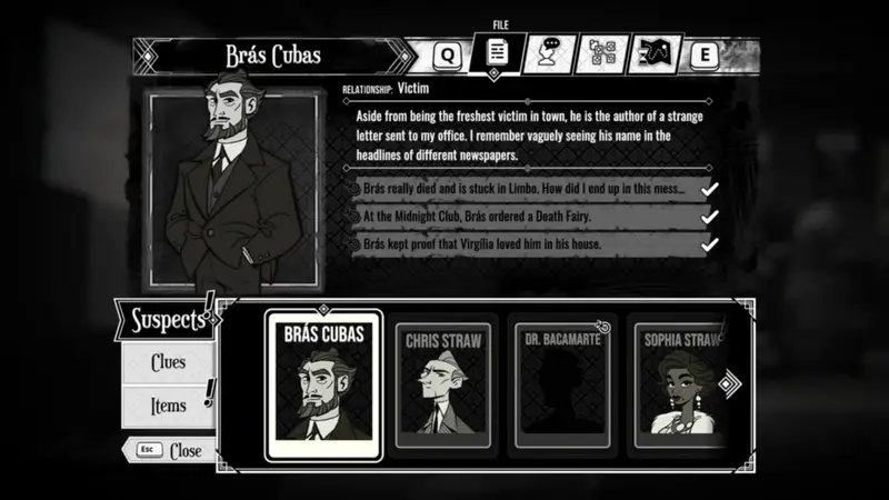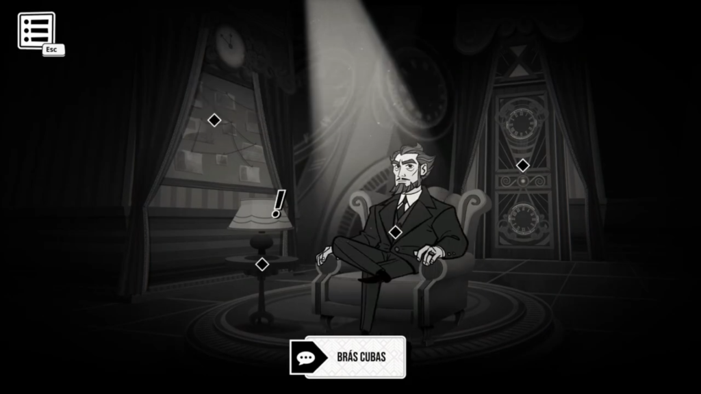 The testimonies of suspects are not the only ones you’ll have to question. As the clock strikes midnight you’ll find yourself in a room with the deceased Brás Cubas. Not only has he hired you to investigate his murder, he’ll help you out a bit along the way. At the end of each night you’ll find yourself speaking with him to either review any new information you learned or even ask for a hint if you find yourself stuck on your next steps. Even I found myself referring back to this every once in a while when I found myself at a loss. The hints are given in a way that does not tell you everything you need to do, but just enough to set you on the right track.