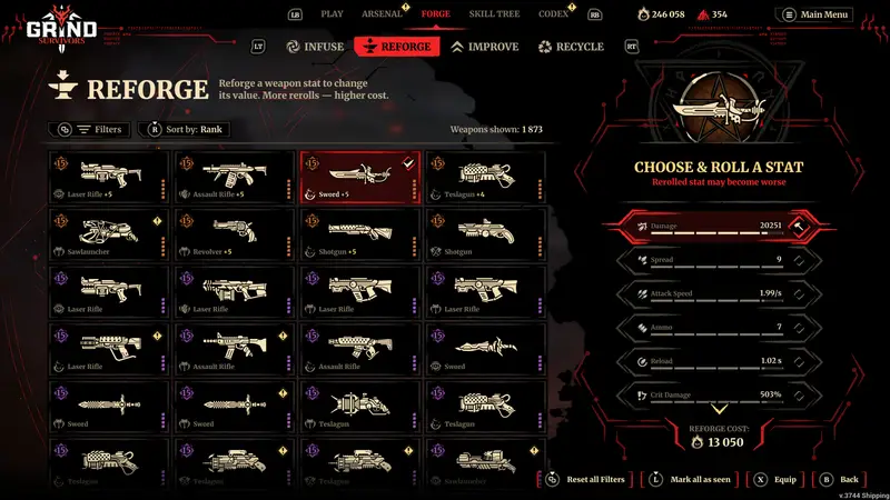 Reforge allows you to spend ashes to increase your weapon stats. You do take a risk doing this, as you might increase it or decrease it. If the stat is already pretty high, it might be best to leave it as is and focus on the lower stats. You will also want to wait to reforge your weapon until you improve it, as all stat changes will be erased when improving.