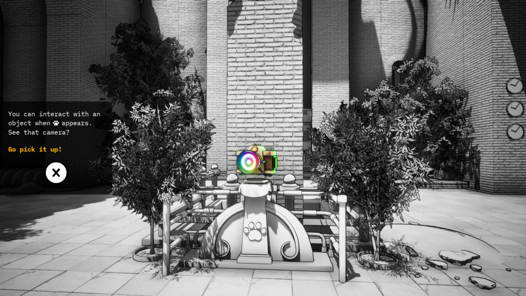 The demo for Cat Me If You Can starts in a new tutorial area, a trippy mish-mash of historic architecture floating in the endless vacuum of space. Just like the rest of the game’s levels, the tutorial is completely black and white, using the black, star-dotted skybox to really make the level pop. Short and friendly text boxes pop up to lead me through the game’s basic movement controls, like ducking, jumping, and sprinting, the linear path guiding me to my first piece of equipment, my camera. Any of my own equipment is always fully coloured, giving each monochromatic level a fun splash of colour and making them easy to find when exploring.