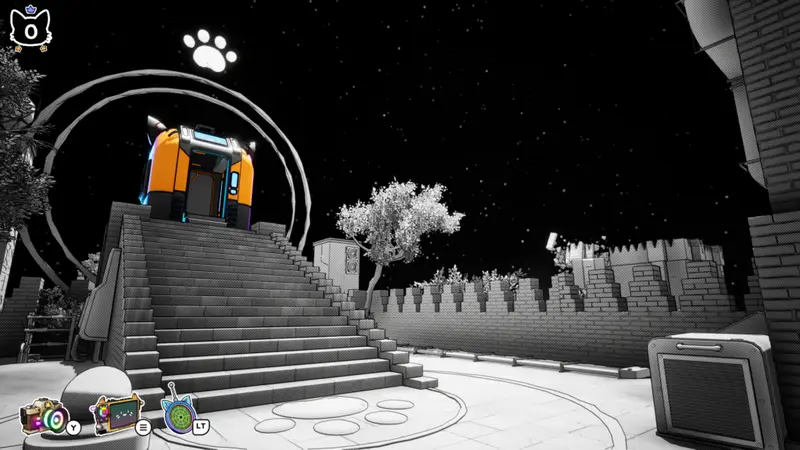 Not long after finding the camera, the demo begins to introduce some of the tools that help track your progress. A tablet keeps tabs on each level’s quests, items, and even your favourite photos, while a radar can briefly ping nearby cats or important items you haven’t found yet. The radar is super handy for finding those last few cats or items that elude you, and its cooldown can be adjusted so you can use it more often; another great quality-of-life detail. The demo also introduces large orange and teal floating noticeboards that track your progress in different areas of a level. Each cat photo you take is added to the board, and you can even fast-travel between them.