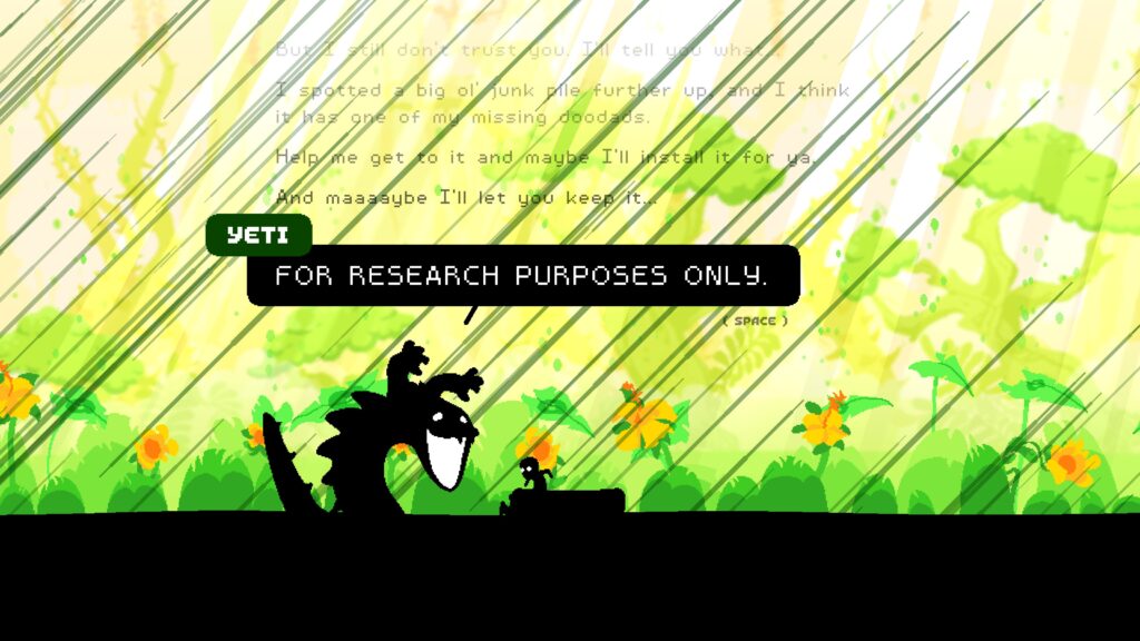 Alas, that gunboat you landed in isn’t yours to just claim, it belongs to your friendly neighbourhood crocodile, Yeti. Yeti is something of a mechanical genius and has created the gunboat you find yourself in. You prove yourself to be something of a natural in the gunboat (naturally) and Yeti is keen to take advantage of your skills. This is not in a malicious way of course, Yeti wants to repair and tinker with the gunboat, making it godly, and to do that he’ll help you seek you revenge. Yeti is a fun companion who does all the talking, he’s a bit of a goof who regularly provides you with tips and a bit of comic relief.