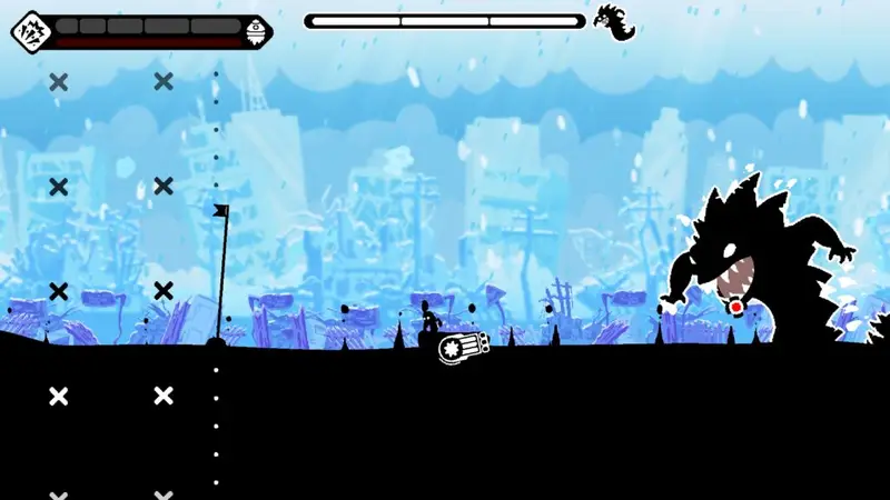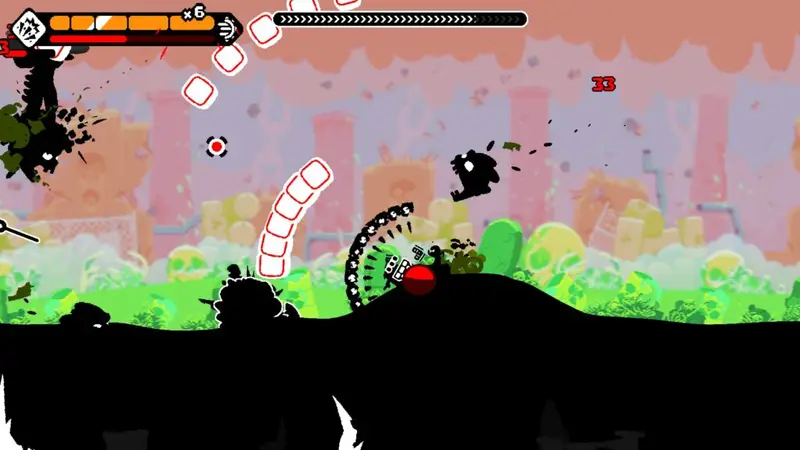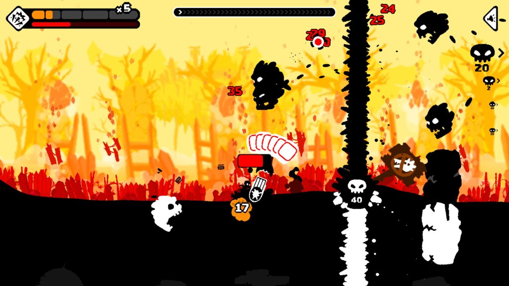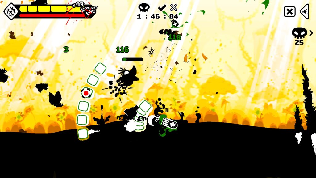 I love, love, love the art design of Gunboat God. All the characters and foreground stuff are black and white. If it’s above the ocean, it’s black, if it’s below the water, white. All the colour comes from the vibrant backgrounds that change between each world and it works so well. As you can see from the screenshots in this review, it just pops!