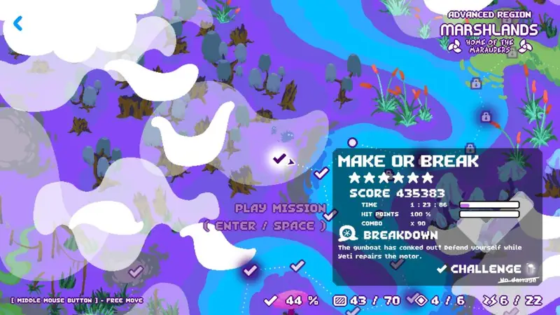 212 sounds like a lot of levels, but they are all almost exclusively super quick, like less than a minute. In fact, the faster you complete them the better you rank! Each level is designed as a mini challenge with one objective (mainly) per mission. These vary between getting across the level; jumping, dodging and dashing over, and under obstacles to destroying all the enemies in a zone. Other times, Yeti gets involved and he might want a race across the level, or he’s searching for a new item for the gunboat and needs protecting as he searches. There’s even a couple of levels that have you ‘juggling’ an enemy across the map, and he can’t touch the water.