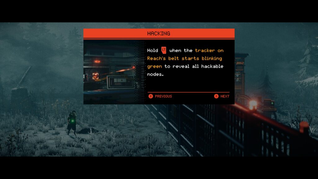 Hacking is indicated by a little green flash going off on Reach’s coat. This indicates that something nearby is hackable. Press and hold LT (Xbox controller) to take out the hacking device and press Y to hack. This will trigger a mini-game on your Wingman.