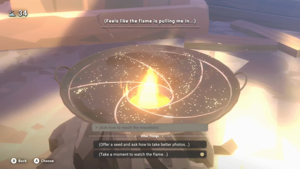 While you begin without a camera, that doesn’t mean one shouldn’t take a look at everything around you. Get used to this mechanic. This game truly is about seeing everything. Be the seer. But how does one do that? You’ll want to interact with everything you find to earn seeds. Players earn seeds on the first time you investigate an item. You’ll use the seeds at lit fire bowls throughout the game. These seeds will help you continue to unlock camera upgrades once you get the camera and allow you to progress the story at times.