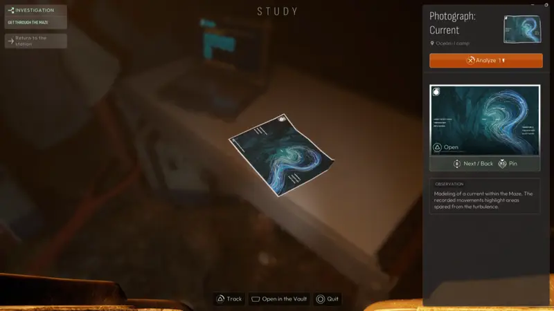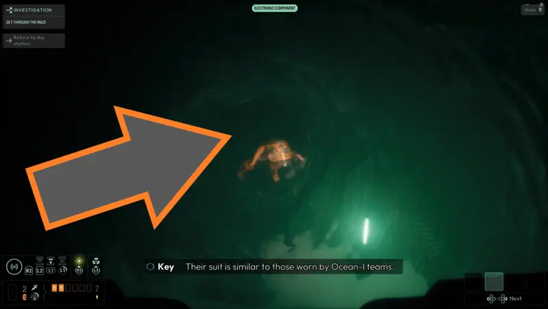 Continue following the frequency passed the body of Arif El Fassi to find a small Ocean-I camp outside of the water in a small cavern. Search the camp to find a tablet with information on the water currents obstructing certain tunnels.